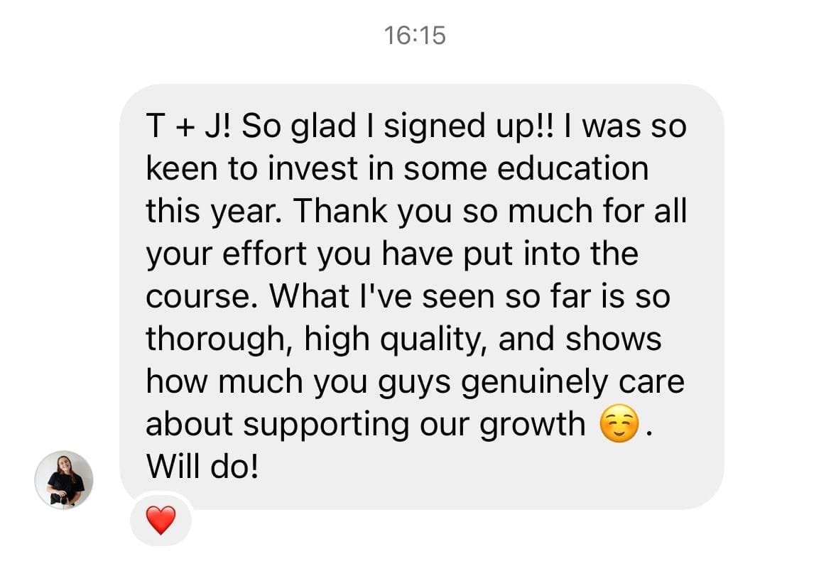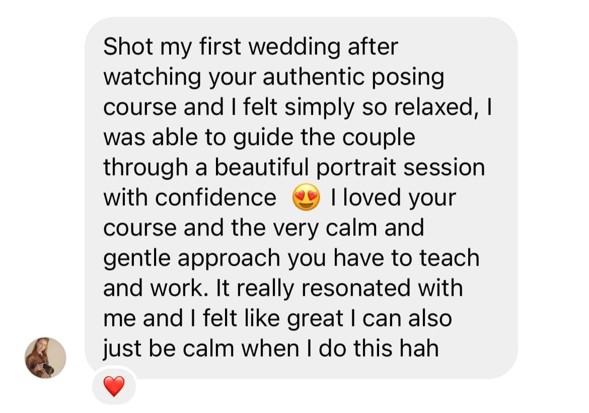 "Trent and Jessie’s Authentic Posing course is truly transformative. It goes beyond posing techniques to instil the confidence you need to make your couples feel at ease and themselves. The course helps you stay true to your own style and personality while emphasising the importance of connecting on a personal level. Its clear and easy-to-follow structure makes it the perfect refresher before a wedding day."
